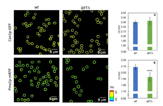 In order to evaluate the impact of changing sphingolipid composition of S. cerevisiae plasma membrane in the organization of MCC and MCP, the time-resolved fluorescence properties of Can1p tagged with GFP (Can1p-GFP) and Pma1p tagged with mRFP (Pma1p-mRFP) were studied by FLIM both in living wt and ipt1Δ cells. As already mentioned, Can1p is found in MCC domains that co-localize with ergosterol staining by filipin, whereas Pma1p is the hallmark of MCP which seems to be intimately related with sphingolipids, but with no direct evidence for sphingolipid enrichment [3].