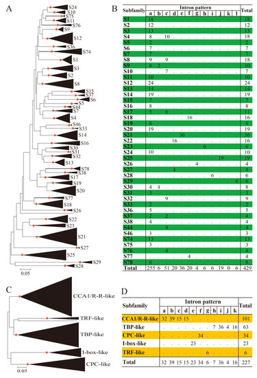 Phylogenetic relationships and intron patterns of MYBR and 2R-MYB proteins from Brassica napus (Bn) and Arabidopsis thaliana (At). The unrooted phylogenetic trees were constructed using the neighbor-joining (NJ) method based on the alignment of the MYB domains of the 429 B. napus 2R-MYBs and 127 A. thaliana 2R-MYBs (including the CDC5 like proteins), and the MYB-like domains of the 227 B. napus and 68 A. thaliana MYBR proteins, respectively. Nodes with bootstrap values ≥70% are dotted in red. The scale shows the relative differences in the examined sequences. Subfamilies are represented in compressed subtree by black triangles with both depth and width proportional to sequence divergence and size, respectively. (A) The NJ tree of 556 2R-MYB proteins from B. napus (429 proteins) and A. thaliana (127 proteins), which were divided into 43 subfamilies (S1–S33, S36–S38, S44, S46, and S74-S78). (B) Summary of intron patterns identified for the 43 B. napus 2R-MYB subfamilies. Intron patterns ‘d–h’ and ‘l’ were designated by referring to Du et al. 2015 [5]. (C) The NJ tree of 295 MYBR proteins from B. napus (227 proteins) and A. thaliana (68 proteins), which were clustered into five subfamilies, namely CCA1/R-R-like, TBP-like, CPC-like, I-box-like and TRF-like. (D) Summary of intron patterns identified for the five B. napus MYBR subfamilies. Intron pattern designation (‘a–k’) was referred to Du et al. 2013 [4].