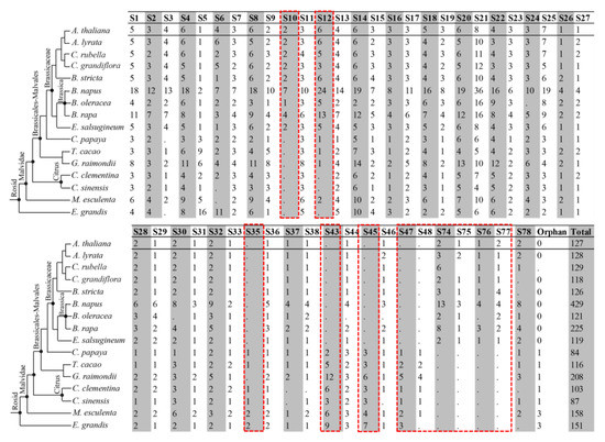 Presence/absence of the 2R-MYB genes in 16 representative plant genomes by phylogenetic position. Numbers of 2R-MYB genes in each subfamily (S1–S78) are shown. Red boxes indicate the lineage-specific subfamilies present or absent in nine Brassicaceae species.