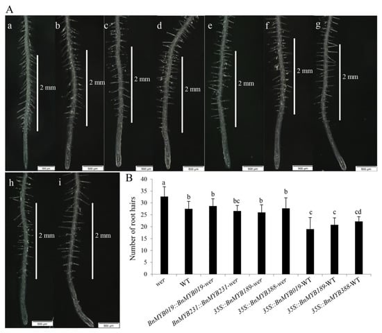 Complementation assay of root hair density in the Arabidopsis thaliana wer mutant background using the four Brassica napus WER-homologous genes BnMYB019, BnMYB189, BnMYB231, and BnMYB388. (A) Representative picture showing root hair morphology and density (2 nm) in 7-day-old A. thaliana seedlings of wer mutant (a), wild-type (WT) (b), and wer mutant plants harboring BnMYB019::BnMYB019 (c), wer mutant plants harboring BnMYB0231::BnMYB231 (d), wer mutant plants harboring 35S::BnMYB189 (e), wer mutant plants harboring 35S::BnMYB388 (f), WT plants harboring 35S::BnMYB019 (g), WT plants harboring 35S::BnMYB189, and (h) WT plants harboring 35S::BnMYB388 (i). (B) Root hair density in 7-day-old A. thaliana seedlings of the corresponding lines (n = 3, 10 plants/genotype/experiment). Different letters indicate significant differences (least significant difference test; p < 0.05).