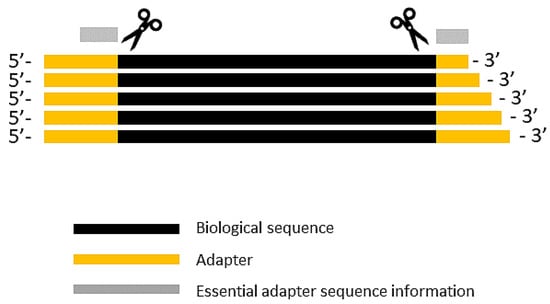 Adapters are oligonucleotides ligated during the sequencing library preparation to the 3′ and sometimes 5′ ends of biological sequences [1]. The formed sequence templates are usually immobilized to a flow-cell or to beads, as in the case of Illumina or Ion Torrent sequencing technologies, respectively [2]. An adapter helps in the specific enrichment of adapter-ligated DNA during the PCR step. The size of the sequence of interest is referred to as the insert size [2]. Most sequencing machines are compatible to read insert sizes ranging from 35 to 1000 base pairs (bp) depending on the sequencing platform and instrumentation used [2,3]. When reads have insert sizes less than ~50 bp, the output from some sequencing platforms, such as Illumina or SOLiD, would also harbor the biological sequence along with the adapters [3]. In addition, some outputs from Illumina sequencing may also contain a four-letter barcode at the 5′ end. In the case of Ion Torrent and 454 platforms, both the 5′ and 3′ adapters are present.