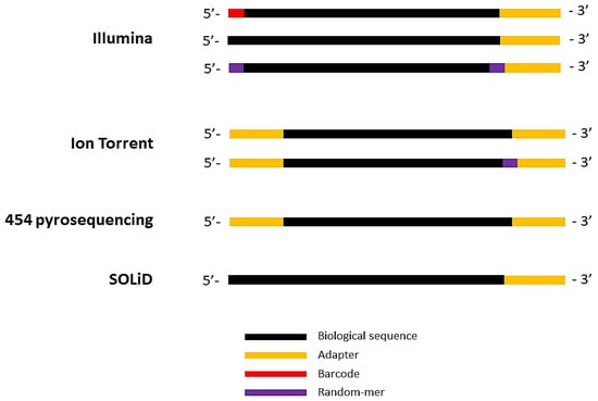 Schematic representation of output reads data format in different sequencing technologies. In all the four sequencing technologies, 3′ end adapters are ligated to biological sequences in the sequencing outputs; in addition, 5′ end adapters are present in Ion Torrent and 454 pyrosequencing outputs. The Illumina output reads may have four-letter barcode in the 5′ end, and/or random 4 “N” nucleotides at both ends. Similarly, depending on the library preparation kit used, output reads from Ion Torrent might have random 5-mer and a three-letter barcode in addition to 5′ end and 3′ end adapters.