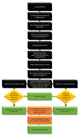 The detection of randomized nucleotides, which are used in randomized adapter protocols, needs an additional procedure. The tool, random_mer, requires the same set of dependencies as adapt_find and uses the same blast approach. However, the reference genome of the species of interest is used as a subject for blasting. The top 750 sequences with length greater than or equal to 29 are used as query sequences, which are blasted against the reference genome with an ungapped alignment. The principle behind this approach is that when a read has random bases on both or either one of the ends, only the biological sequence of the read is aligned to the reference. Meanwhile, the part that has the random bases would not align to the reference genome. The presence or absence of random “N” bases can be computed by parsing the output parameters from BLAST such as the aligned sequence, query start, and query end position. The output csv file is parsed to check if all the aligned sequences have a common query start position. Similarly, the query end position is subtracted from the total length of the read to calculate the length of unaligned sequence at the 3′ end. Computing the most frequent start site will identify random_mers at the 5′ end. For example, if there is a random 4-mer at the 5′ end, most inserts will have the sequence start position at 5th nucleotide. Random_mers at the 3′ end are predicted by computing the length of an unaligned sequence at the 3′ end for each query sequence and calculating the most common length of all such unaligned sequences. The flowchart showing the steps involved in random_mer detection is shown in Figure 4.