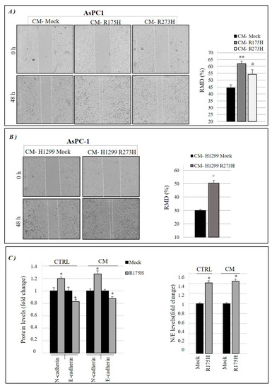 3.3. Mutp53-Driven Secretome Stimulates Cancer Cell Migration and Epithelial-to-Mesenchymal Transition