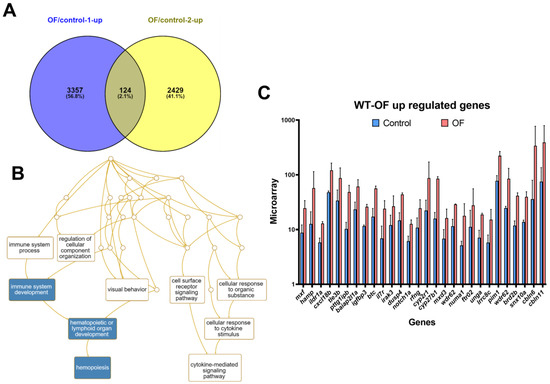 Upregulation of immune system development-associated genes, such as an anti-viral gatekeeper for mxf as well as host defense multiple microbial, hamp, in oligo-fucoidan (OF)-fed wild-type zebrafish. (A) Venn diagram of the upregulated genes from two batches of experiment between OF-fed and control fish; (B) Gene ontology analysis revealed genes involved in immune system development, hematopoietic or lymphoid development, and hematopoiesis were enriched. (C) The selected genes that are upregulated by OF from the microarray analysis.