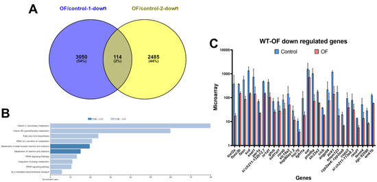 Downregulation of fatty acid metabolism, the peroxisome proliferator-activated receptors (PPAR) signaling pathway, and steroid biosynthesis-associated genes in OF-fed wild-type zebrafish. (A) Venn diagram of the downregulated genes from two batches of experiment between OF-fed and control fish. (B) Kyoto Encyclopedia of Genes and Genomes (KEGG) pathway analysis revealed that the genes involved in fatty acid metabolism were enriched. (C) The selected genes that are downregulated by OF from the microarray analysis.