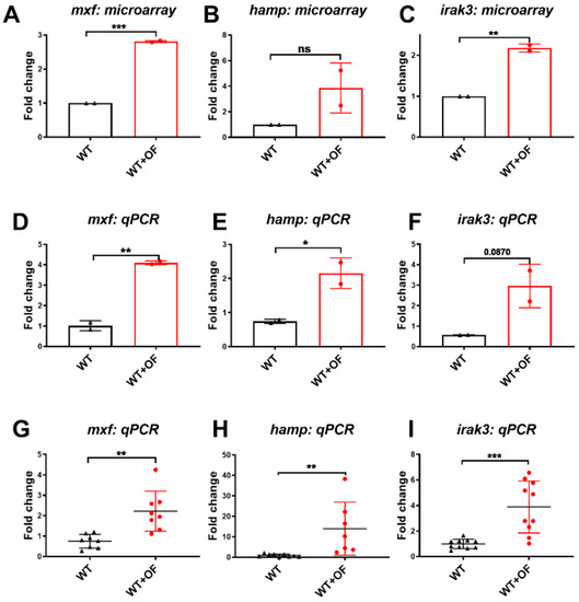 Microarray versus qPCR validation for three upregulated genes in OF-fed and control zebrafish. (A–C) The fold changes of oligo-fucoidan fed wild-type (WT+OF) zebrafish versus the no-treatment control (WT), where each dot represents the average of two fish from the same batch. (D–F) Quantitative polymerase chain reaction (qPCR) analyses for the same samples that were used in microarray, where each dot represents average of two fish from the same batch. (G–I) Quantitative polymerase chain reaction (qPCR) analyses for the all OF-fed wild-type fish (red) versus the untreated controls (black), where each dot represents one fish. Statistical analyses were performed with Student’s t-test (*0.01 < p ≤ 0.05; **0.001 < p ≤ 0.01; *** ≤ 0.001, ns: non-significance).