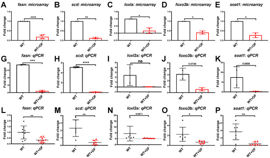 Microarray versus qPCR validation for five downregulated genes (fasn, scd, loxl2a, foxo3b and soat1) in OF-fed and control zebrafish. (A–E) The fold changes of OF-fed wild-type zebrafish versus the no treatment controls, where each dot represents the average of two fish. (G–K) qPCR for the same samples that were used in the microarray, where each dot represents the average of two fish. (L–P) qPCR analyses for all OF-fed fish (red) versus untreated controls (black), where each dot represents one fish. Statistical analyses were performed with student’s t-test (* 0.01 < p ≤ 0.05; ** 0.001 < p ≤ 0.01; *** 0.0001 < p ≤ 0.001; **** p ≤ 0.0001).