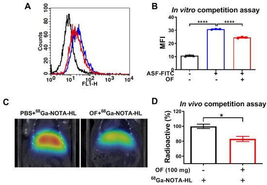 The in vivo competition assay was performed as described previously [26]. Adult Bagg albino strain c (BALB/c) mice were purchased from the National Laboratory Animal Center and kept in clean conventional conditions. The animals were fed ad libitum. The 68Ga-NOTA-HL (68Ga-2,2’,2’’-(1,4,7-triazonane-1,4,7-triyl) triacetic acid-hexavalent lactoside) was synthesized by the Institute of Nuclear Energy Research (Atomic Energy Council, Yonghe Dist., New Taipei City, Taiwan) and was capable of binding to ASGPR in the body [27], which could be considered as the ligand for ASGPR. To confirm whether OF binds to ASGPR on hepatocytes in vivo, 100 mg OF and PBS was administrated respectively 1 h prior to the 68Ga-NOTA-HL intravenous injection. The injection dose of 68Ga-NOTA-HL was 200 ± 20 μCi. The in vivo competition studies were approved by the ethical review committee of the Institute of Nuclear Energy Research.