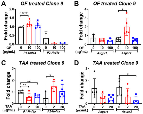 There are two isoforms of hepatocyte nuclear factor-4α (HNF4A), the P1- and P2-isoform. The P1-HNF4A exhibits a tumor-suppressive effect, and P2-HNF4A acts as an oncogene in hepatocyte [39]. Beta-catenin repressed the activity of P1-Hnf4a expression and has been reported to be responsible for colon tumorigenesis [40]. We examined whether the P1 isoform was enhanced by OF treatment. Our results indicated that OF treatment promoted the P1-Hnf4a expression, but it suppressed the P2-Hnf4a dramatically in Clone 9 cells (Figure 8A). The expression level of Asgpr2 was also increased by OF treatment in the 10 μg/mL OF-treated group but there were no changes in the 100 μg/mL OF treatment group (Figure 8B). To explore the role of Hnf4a isoforms in hepatocytes, the chemical carcinogen thioacetamide (TAA) was utilized to treat Clone 9 cells. We found that TAA exhibited an opposite effect to hepatocytes compared to OF. TAA treatment downregulated P1-Hnf4a but upregulated P2-Hnf4a expression in Clone 9 cells (Figure 8C). Thioacetamide also reduced the Asgpr1 and Asgpr2 expression levels (Figure 8D).