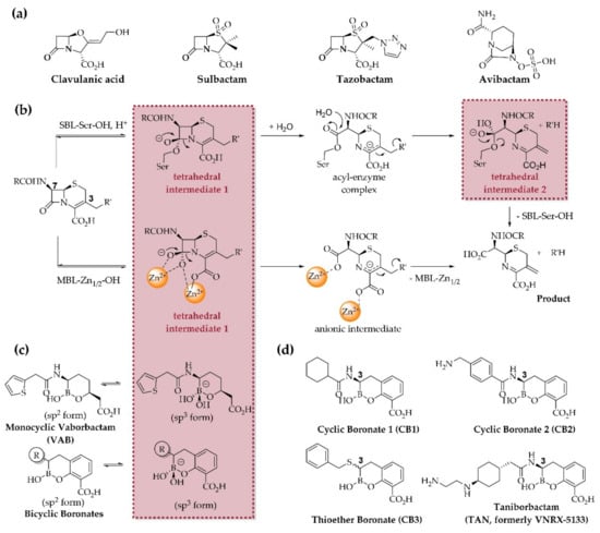Mechanistic basis for β-lactamase inhibition by (bi)cyclic boronates. (a) clinically used β-lactamase inhibitors; (b) outline general mechanisms of SBLs and MBLs, exemplified by hydrolysis of a cephalosporin with elimination at C-3’. The tetrahedral intermediates, common to both SBL and MBL catalysis, may be mimicked by the sp3 form of (bi)cyclic boronates; (c) equilibria between sp2- and sp3-hybridized forms of mono- and bi-cyclic boronates; (d) structures of bicyclic boronate β-lactamase inhibitors cyclic boronate 1 (CB1), cyclic boronate 2 (CB2), the thioether boronate (CB3), and taniborbactam (TAN, formerly VNRX-5133). Note that the CB3 used in this study contained a mixture of the (3S)- and (3R)-enantiomers (~1:3, respectively) [16].