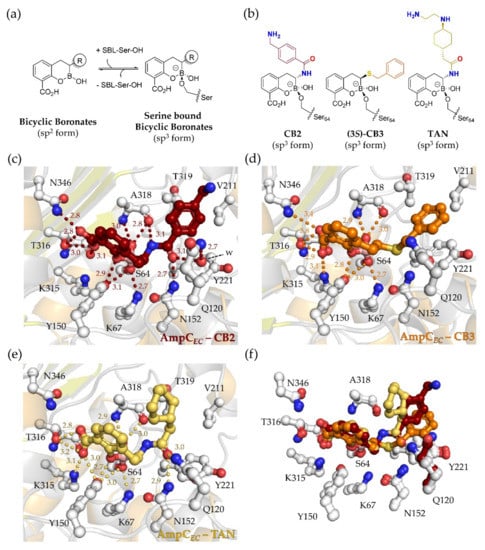 Structural basis for AmpCEC inhibition by bicyclic boronates. (a) reaction between sp2-hybridized bicyclic boronates and SBLs give a serine-bonded anionic sp3-hybridized species; (b) structures of serine-bonded sp3 forms of the bicyclic boronates; (c–e) active site views of complexes of AmpCEC with CB2, CB3, and TAN. Hydrogen-bonding interactions are shown in colored dashes, distances are in Å; (f) overlay of active site views, color coding as in (c–e). Note that the Q120 side chain is rotated in AmpCEC-CB2 structure (highlighted in dark red); it is unclear whether this is induced by binding of CB2, or due to the crystallization conditions (see text).