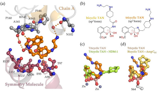 Comparison of bi- and tri-cyclic forms of sp3 hybridized taniborbactam in complex with AmpCEC. (a) The tricyclic form of TAN as observed at the interface between symmetry related AmpCEC molecules along a three-fold rotation axis (see Figure S3a for overview, PDB ID 6YEN). Residues within 6 Å of TAN are shown as grey/purple sticks, hydrogen-bonding interactions as orange dashes, and waters as red spheres; (b) structures of proposed bi- and tricyclic sp3 forms of TAN; (c) overlay of the ‘interface’ tricyclic TAN (AmpCEC, orange) with active site bound tricyclic TAN (NDM-1, green); (d) overlay of the ‘interface’ tricyclic TAN (AmpCEC, orange) with active site bound bicyclic TAN bonded to AmpCEC S64 (yellow). Note, with the MBL NDM-1 (PDB ID: 6RMF), both the bicyclic and the tricyclic forms were observed in one chain of the crystallographic dimer (chain A, shown here), while, in the second chain, only the tricyclic form was observed [24].
