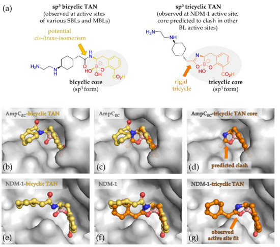 Tricyclic TAN likely cannot bind at the AmpCEC active site due to a steric clash of the putative tricyclic core and side chain. (a) Structural comparison of tricyclic and bicyclic forms of TAN; (b–g) overlay of tricyclic TAN core (orange, not crystallographically observed at AmpCEC active site) with bicyclic TAN (yellow) crystallographically observed bound to active site S64 of AmpCEC (PDB ID: 6YEN) reveals a likely steric clash of the rigid tricycle in the AmpCEC active site as well as active sites of other β-lactamases (Figure S5). By contrast, both tricyclic (orange) and bicyclic (yellow) forms of TAN have been crystallographically observed at the active site of the B1 MBL NDM-1 (PDB ID: 6RMF) [24]. Note, in both structures, that the terminal amine of the side chain was disordered and therefore excluded from the model; (b) observed conformation of bicyclic TAN at the AmpCEC active site; (c) alignment of tricyclic TAN core to bicyclic TAN observed at the AmpCEC active site; (d) putative steric clash of tricyclic TAN in the AmpCEC active site based on the overlay in c). Note the apparently flexible parts of the side chain are not shown, but would make a clear steric clash with the active site; (e) observed conformation of bicyclic TAN at the NDM-1 active site; (f) overlay of tricyclic TAN and bicyclic TAN, both as observed at the NDM-1 active site; (g) observed conformation of tricyclic TAN at the NDM-1 active site.
