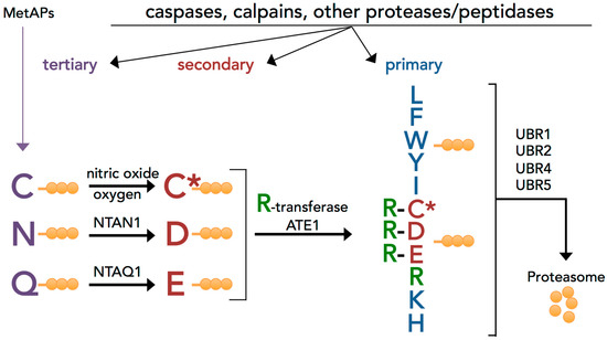 The mammalian Arg/N-degron pathway. N-terminal residues are indicated by single-letter abbreviations for amino acids, and the rest of a protein substrate is represented by orange spheres. “Primary”, “secondary”, and “tertiary” denote mechanistically distinct subsets of destabilizing N-terminal residues. C* denotes oxidized N-terminal Cys, either Cys-sulfinate or -sulfonate. The mammalian N-recognins UBR1, UBR2, UBR4, and UBR5 (EDD) have multiple substrate-binding sites that recognize internal and terminal N-degrons and target them to the proteasome. MetAPs: methionine aminopeptidase, NTAN1: N-terminal asparagine amidohydrolase, and NTAQ1: N-terminal glutamine amidohydrolase (adapted from [21]).