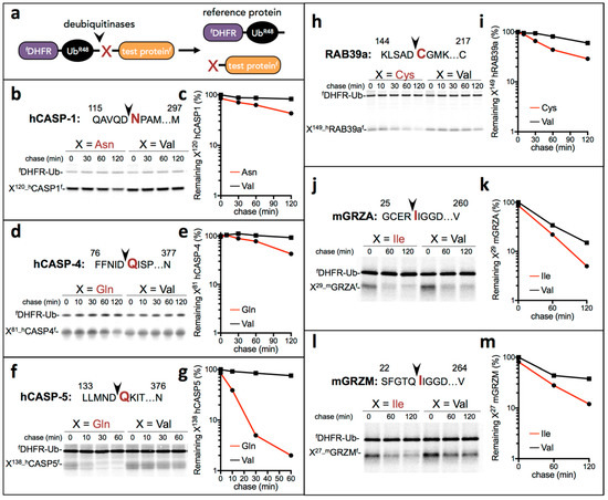 Proinflammatory fragments are short-lived N-degron pathway substrates. (a) The URT assay [21,38]. (b) The cleavage site in human CASPASE-1 is indicated by an arrowhead, with the destabilizing residue shown in red. Residue numbers are the numbers of the first-shown residue and the last residue of the full-length protein. Asn120-hCASP-1 (produced from fDHFR-UbR48-Asn120-hCASP-1f) and Val120-hCASP-1 were expressed in the reticulocyte extract and labeled with 35S-Met/Cys for 10 min at 30 °C, followed by a chase, immunoprecipitation with an anti-flag antibody, SDS/PAGE, and autoradiography. (c) Quantification of B using the reference protein fDHFR-UbR48. (d) Same as b but with human X81-CASP-4f (X = Gln and Val). (e) Quantification of d. (f) Same as b but with human X138-CASP-5f (X = Gln and Val). (g) Quantification of f. (h) Same as b but with human X144-RAB39af (X = Cys and Val). (i) Quantification of h. (j) Same as b but with mouse X29-GRZA (X = Ile and Val). (k) Quantification of j. (l) Same as b but with mouse X27-GRZM (X = Ile and Val). (m) Quantification of l.
