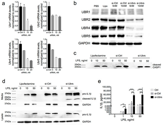 Increased IL1β secretion after the downregulation of Ubr-ubiquitin ligases of the Arg/N-degron pathway. (a) mRNA and (b) protein levels of UBR1, UBR2, UBR4, and UBR5 in J774A.1 cells after 72 h of exposure to 5 or 10-nM siRNA. (c) Western blot analysis of cleaved CASPASE-1 secreted in the media of J774A.1 cells treated with 10 nM of si-Ctrl or siRNA against Ubr (UBR1, UBR2, UBR4, and UBR5) for 72 h, followed by 1, 10, or 50 ng/mL of LPS for 6h and 5-mM ATP for the last hour. (d) Western blot analysis of pro- and cleaved IL-1β from the media and lysates of cells treated as in (c). (e) Quantification of the secreted pro- and cleaved IL-1β from the media of J774A.1 cells treated as in (c) by the cytokine bead assay (CBA) P-values were determined by a one-way ANOVA (** p < 0.01, *** p < 0.001 and **** p < 0.0001).
