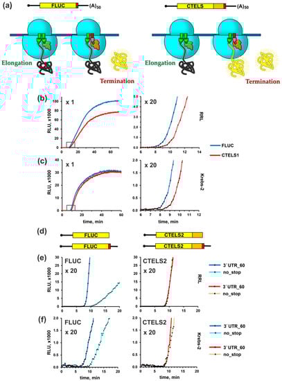 To use CTELS further for investigating translation termination, we had to confirm the ability of extended luciferase to be active before its release from the ribosome, reported earlier [,], in our hands. For this, we used the CTELS2 system to prepare two transcripts encoding luciferase with and without extension, but lacking a stop codon (i.e., both transcripts ended with the last sense codon of the coding region, Figure 1d). Then, we compared their translation kinetics with the one produced by the corresponding conventional, stop codon containing mRNAs, the pair of FLUC and CTELS2 transcripts that had the 60-nt long 3′ UTRs (agcatc)10. In the absence of stop codon, translation termination could not occur normally. Instead, a special rescue surprise pathway operated with peptidyl-tRNA on the ribosome in this case (for review, see [,,]).