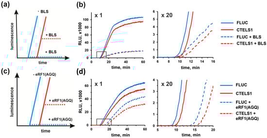Examination of low- and high molecule weight inhibitors by the CTELS approach. (a) Theoretical prediction of blasticidin S (BLS) effects on FLUC and CTELS1 translation, considering the drug specifically inhibits termination. When the compound was added to the cell-free system programmed by FLUC (blue curves), it should suppress its translation due to inhibition of peptide release, while its addition to the mixture with CTELS mRNA (red curves) should not affect the luciferase activity yield at the initial step, until all enzyme molecules synthesized by pioneering ribosomes are completed; only after that CTELS mRNA translation should be also locked, resulting in a plateau in the curve. (b) Luciferase activity produced by translation of capped and polyadenylated FLUC and CTELS1 mRNAs in RRL. Representative curves of three independent experiments are shown. (c). Theoretical prediction of eRF1(AGQ) effects on FLUC and CTELS1 translation, considering the protein specifically inhibits termination. (d) Results of an experiment with the same reporter mRNAs as in (b) with addition of 25 ng/μL of the eRF1 mutant (dotted curves) or buffer (solid curves).