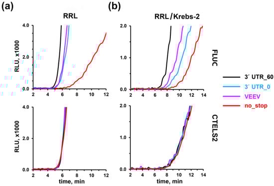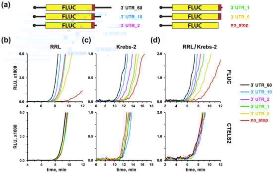 To systematically investigate the effects of short 3′ UTR on translation termination, we used the CTELS2 system to prepare 5 pairs of stop-codon containing non-polyadenylated transcripts with various 3′ UTR lengths, ranging from 0 to 60 nt (Figure 3a). We also took the mRNA pair with no stop codon, as described above. Translation of these 12 constructs in RRL revealed pronounced delays in the appearance of luciferase activity, depending on the 3′ UTR length, in the case of FLUC transcripts (Figure 3b). However, for all CTELS2 derivatives, the activity arose roughly at the same time (Figure 3b, lower panel). This indicated marked problems occurring specifically at the termination stage. Although the termination failure in cases of the FLUC transcripts with short 3′ UTRs was much less dramatic than with the construct lacking stop codon, the delay was still clear even for the transcript having the 10-nt 3′ UTR. A similar pattern of termination failure was detected for the Krebs-2 S30 extract (Figure 3c), although in this system the nonstop luciferase transcript produced luciferase after a shorter delay, as evident from its comparison with FLUC mRNA having zero-length 3′ UTR. It probably reflected the presence of more efficient “nonstop” rescue pathway in Krebs-2 cells, as suggested above. Finally, we repeated the experiment in the RRL/Krebs-2 hybrid lysate, since such chimeric in vitro systems combine the best features of both their components—high translation efficiency of RRL and relevance to living cells, inherent to the extracts prepared from cultured cells []. This hybrid system reproduced the effects observed above (Figure 3d), showing aggravated termination defects with the decreasing 3′ UTR length. Thus, we concluded that reproducible translation termination defects caused by insufficient 3′ UTR length are well documented with the CTELS approach.