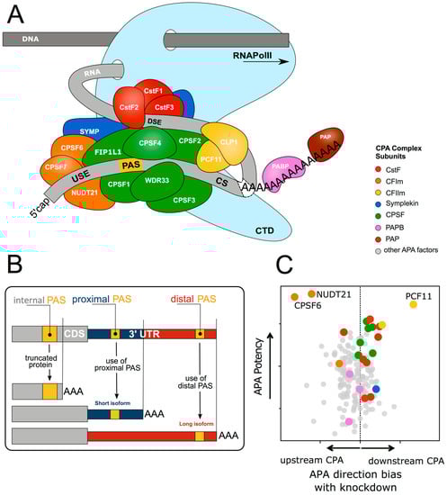 Finally, alterations in CstF have been observed in other disorders. In a transverse aortic constriction mouse model of cardiac hypertrophy 3′UTRs were found to be generally shortened and the expression of CstF components CSTF1, CSTF2, and CSTF3 were found to be up regulated [161]. Thus, although the quantitative effects of the CstF complex on APA are not as strong compared to other components of the CPA machinery [13] (Figure 1C), expression changes can be functionally most significant.