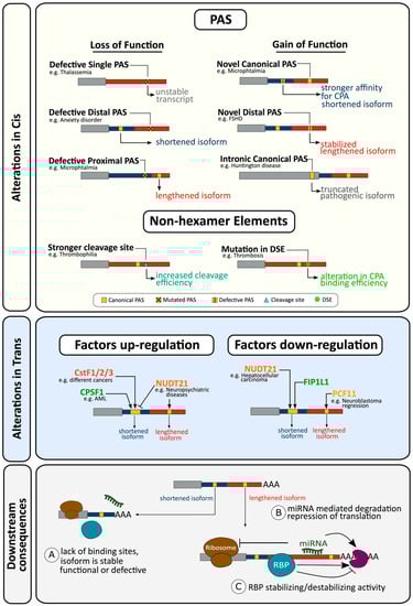 As described in the preceding sections, many alterations in cis, both at the DNA and RNA level, can result in aberrant CPA and ultimately to disease by affecting individual genes. However, as can be seen in the following sections, global alterations affecting CPA and APA in trans are a significant feature of many diseases.