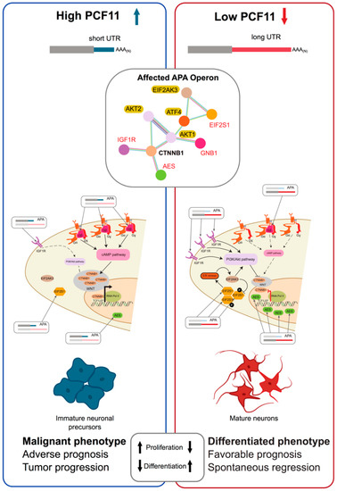 PCF11-directed APA drives neuroblastoma. An example of APA perturbation eliciting deleterious cellular programs. PCF11 is among the top drivers of APA [13], compare TREND-DB (http://shiny.imbei.uni-mainz.de:3838/trend-db/). Postnatal down-regulation results in general 3′UTR lengthening required to induce neurodifferentiation. PCF11-directed APA targets insulin like growth factor 1 receptor (IGF1R), eukaryotic translation initiation factor 2 subunit alpha (EIF2S1), TLE family member 5, transcriptional modulator (AES, TLE5) and G protein subunit beta 1 (GNB1), which constitute a highly enriched APA-operon (Red; String-DB), converging on WNT signalling via beta-catenin (CTNNB1; bold). This alters downstream IGF1R, phosphatidylinositol-4,5-bisphosphate 3-kinase (PI3K)/AKT serine/threonine kinase and endoplasmic reticulum (ER) stress response signalling pathways (highlighted), ultimately modulating cell cycle progression, proliferation, apoptosis and neuronal differentiation. Sustained high level PCF11 expression arrests neuronal precursors in an immature state, giving rise to neuroblastomas. Low-level PCF11 in neuroblastoma associates with favourable outcome and spontaneous tumour regression, while high-level PCF1 associates with adverse outcome and tumour progression (other genes indicated eukaryotic translation initiation factor 2 alpha kinase 3 (EIF2AK3), AKT serine/threonine kinase 2 and 2 (AKT2 and 2), activating transcription factor 4 (ATF4), eukaryotic translation initiation factor 2 subunit alpha (EIF2S1), catenin beta 1 (CTNNB1); figure modified after A. Ogorodnikov, Dissertation, Johannes Gutenberg University Mainz, 2017 “Massive RNAi screening dentifies key drivers of transcriptome 3′end diversity with a direct role in neuroblastoma tumor regression”).