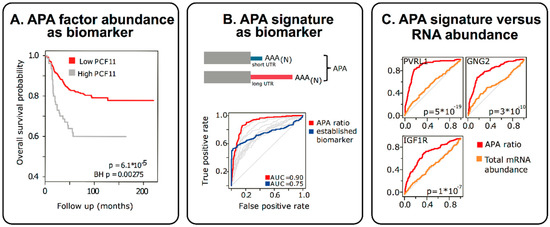 APA perturbations, even when resulting in subtle changes of non-coding RNA sequence elements in the 3′UTR, can be functionally most significant [13]. At the same time they also represent unexpectedly potent novel biomarkers [13,141] (Figure 4). For example, in accordance with the functional role of deregulated expression of individual APA-regulators (e.g., high level PCF11 expression supporting proximal polyadenylation of a neurodifferentiation operon; Figure 3) the protein abundance of such APA-regulators can serve as proxy for disease severity and allows stratifying patients (Figure 4, left panel). As one would expect, this prognostic potential can also be found when analysing the resulting downstream consequences i.e., APA-signatures (Figure 4, middle panel). For example, focusing on a select set of genes in which APA is regulated in a PCF11-dependent manner, the relative proportion of long versus short transcript isoforms functions as a proxy for PCF11-dependent APA deregulation. As such, this can be used as a biomarker to predict the patients’ outcome (in this case in neuroblastoma patients). Interestingly, applying receiver operating characteristics (ROC) curve analysis, these APA-signatures appear to perform far better than common clinically used biomarkers (Figure 4, middle panel) and may thus have potential to directly inform clinical decisions [13]. Furthermore, while the mere gene expression change of a given APA-affected gene may not necessarily be predictive, the APA signature of exactly the same genes (abundance long versus short transcript isoform) shows very high predictive potential (Figure 4, right panel). Altogether, these findings have several implications: (1) APA signatures appear to have high, hitherto unused, diagnostic potential, (2) in some instances APA signatures appear to outperform even existing biomarkers, (3) even genes previously identified to be ‘useless’ for disease stratification may have strong diagnostic potential, when APA signatures of the respective genes are considered, (4) the relative proportion of APA isoforms is ‘internally’ controlled as opposed to expression profiling based on arrays or full RNASeq (which can be dramatically confounded by the way of normalization). APA signatures may thus represent relatively robust biomarkers. In light of the challenges to reliably detect transcriptome 3′ end alterations [339], there is a high demand to further develop technologies that allow the adoption of these untapped diagnostic opportunities.