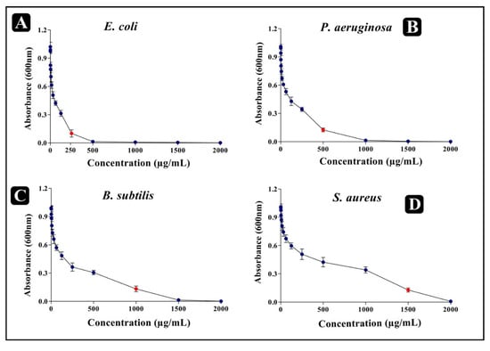 Determination of MIC after taking optical density at 600 nm (A) E. coli, (B) P. aeruginosa, (C) B. subtilis, and (D) S. aureus. All experiments were carried out in triplicate, and data represent the mean ± SEM.