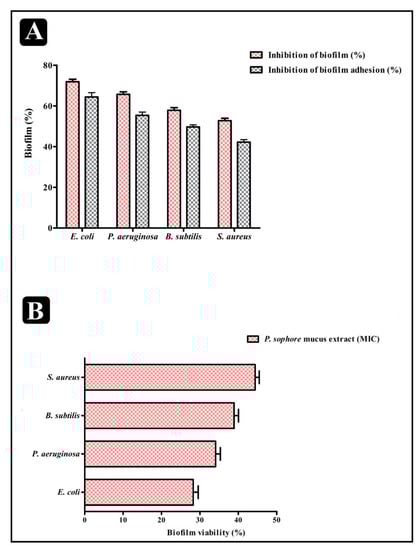All through the time of drug evolution, nature has always been the foremost origin for the discovery of novel bioactive compounds/medications, essential for fighting against infections and various diseases [,]. Over the past decade, novel perspectives in impeding biofilm formation have been extensively developed from natural products, especially from plants, as they demonstrated antimicrobial and chemo-preventive properties [,]. Recently, fishes have been also considered as an unexploited source of prospective novel pharmaceutical products, nutraceuticals, functional foods, and therapeutics []. They display numerous structural characteristics with plentiful sources of bioactive compounds, which could be utilized as novel and potent antimicrobial and antibiofilm drugs. Though fishes are a known enormous source of bioactive compounds, very few fishes have been tested for their biological applications, specifically for their antibiofilm potency. In this context, we evaluated the antibiofilm and antibacterial potential of P. sophore (F. Hamilton, 1822) mucus extract.