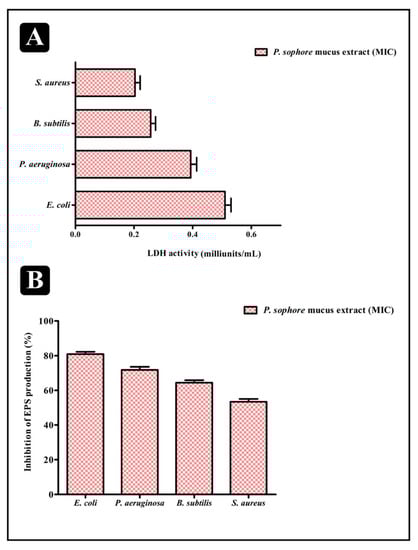 Result of LDH activity assay and total inhibition of EPS production (%). (A) Bacterial cell damage within the biofilm based on LDH activity in the presence of P. sophore mucus extract at their respective MICs. (B) Percentage inhibition of total EPS production in different bacterial strains in the presence of P. sophore mucus extract at their respective MICs. All experiments were carried out in triplicate, and data represent the mean ± SEM.
