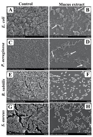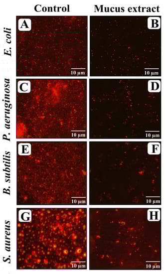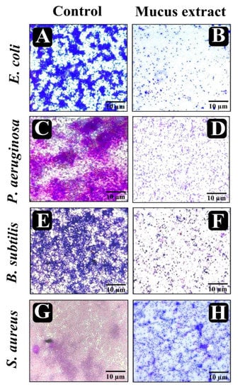 The MIC of mucus extract was carried out via microdilution methods using MHB as described by Clinical and Laboratory Standards Institute (CLSI) with slight modifications []. Bacterial inoculums were prepared in MHB at 37 °C for 24 h. The mucus extract was two-fold diluted ranging from 2000 to 0.48 µg/mL (80 µL as final volume) with final phosphate buffer saline concentration <1%. Afterwards, 20 µL of bacterial suspensions (108 CFU/mL) and 100 µL of MHB were loaded onto microtiter plates and the test was accomplished in 200 µL of final volume. The absorbance of each well was determined using EpochTM microplate spectrophotometer at 600 nm. Plates were then incubated at 37 °C for 24 h. After incubation, the absorbance was read again in the reader at the same wavelength and the obtained absorbance values were subtracted from those obtained before incubation. Assessment was carried out simultaneously for bacterial growth control (MHB + bacteria + mucus extract vehicle) and sterility control (MHB + mucus extract vehicle), as well as for the positive control gentamicin was used. MICs were recorded as the lowest concentration that inhibits the bacterial growth [].