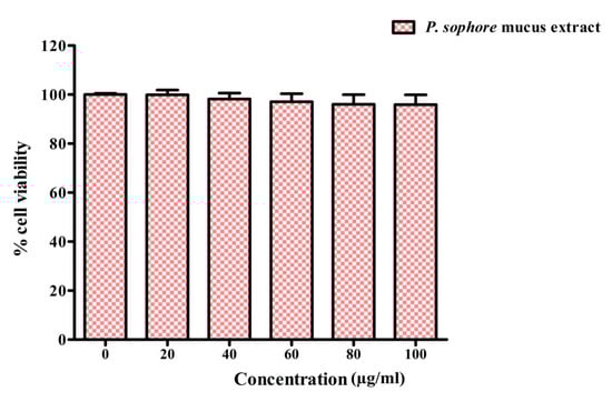Cytotoxicity of P. sophore mucus extract on CRL-1831 cells. All experiments were carried out in triplicate, and data represent the mean ± SEM.