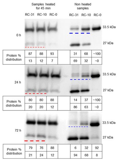 In order to study OmpT autoproteolysis, wild type OmpT was expressed in vitro as IBs that were later solubilized and unfolded in 8 M urea. The unfolded proteins were subsequently refolded in Tris-HCl buffer containing 31, 10, or 0 mM DodMe2NPrSO3 detergent. For the sake of convenience, we refer to these three refolding conditions as RC-31, RC-10, and RC-0 denoting the high, intermediate, and zero detergent concentration, respectively. When OmpT IBs were refolded in the absence of the detergent (RC-0), the protein migrated as a single band at 33.5 kDa in an SDS-PAGE gel regardless of heat treatment, indicating that all of the OmpT was unfolded (Figure 2, non-heated and 45 min-heated samples, Lane RC-0). As previously reported, and confirmed here, the presence of the detergent during the refolding process aids in the proper refolding of OmpT from the IBs [33,34,35]. At this point, the apparent refolding efficiencies for RC-31 and RC-10 equal ~69% and 32%, respectively, based on the relative intensities of the two bands at 33.5 and 27 kDa for the non-heated samples (Figure 2, non-heated samples, Lane RC-31 and RC-10), a clear indication that excess detergent is essential to achieve higher refolding efficiencies. However, this is not the complete story as will be discussed below. The specific activity for the RC-31, RC-10, and RC-0 samples measured using a previously reported FRET assay [19] was calculated to be 13.01 nmol min−1 mg−1, 5.64 nmol min−1 mg−1, and close to 0 pmol s−1 (Figure S3—Day 0, data not shown for the RC-0 sample), and these values correlated well with the refolding efficiency (Figure 2, 0 h for the non-heated samples).