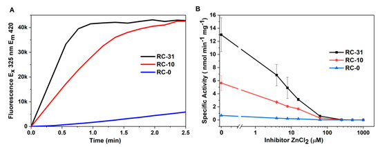 FRET cleavage and inhibitor assays for OmpT in three refolding buffers containing different concentrations of detergent, RC-31, RC-10, and RC-0. (A) Change in fluorescence emission intensity due to cleavage of FRET-peptide by OmpT. (B) Protease activity measurements in the presence of increasing inhibitor (ZnCl2) concentration and plotted as specific activity vs. inhibitor concentration. Note: To avoid the 0 value on the X-axis of the semi-logarithmic plot in (B), the specific activity corresponding to 0 µM ZnCl2 was plotted as 0.01 µM ZnCl2.
