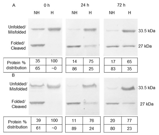 Although the initial refolding efficiency of ~69% and 32% for the RC-31 and RC-10 samples, respectively, were based on the relative intensities of the 33.5 and 27 kDa bands for the non-heated samples in Figure 2, this did not take into account the contribution of the autoproteolytic fragment to the 27 kDa band. The refolding efficiency was therefore recalculated as follows: Refolding Eff (%) = [(% intensity of 27 kDa band for 0 h, non-heated samples) − (% intensity of 27 kDa band for 0 h, heated samples)]. Basically, the contribution from the autoproteolyzed fragment is removed when calculating the refolding efficiency. For the RC-31 and RC-10 samples, the refolding efficiency was now close to ~60% and 20%, respectively. However, for the RC-31 samples, the refolding efficiency varied between 50–70% for different batches (data not shown) and was difficult to control using the protocol adopted from Kramer et al. (2000) [19]. Despite this difference in the protein refolding efficiency between the different batches, the gradual increase in the level of autoproteolysis and a concomitant loss of unfolded OmpT clearly suggest that the unfolded OmpT underwent autoproteolysis (Supplementary Figure S2).