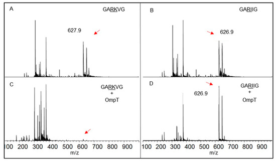 MALDI-TOF experiments were undertaken to confirm that the substrate specificity of OmpT (RC-31(LPS) samples) for the dibasic sites was preserved (Figure 6), in agreement with the established substrate specificity reported in the literature [17,19,20]. When a short synthetic peptide (Seq: GARKVG, MW 627 Da; Figure 6A) carrying a dibasic site in its sequence was treated with OmpT, the signal for the full-length peptide was no longer visible in the MALDI spectra (Figure 6C), indicating complete cleavage of the peptide. A control peptide (Seq: GARIIG, MW 626 Da; Figure 6B) lacking a dibasic site in its sequence was not cleaved by OmpT, as seen from the peak arising from the full-length peptide (Figure 6D).