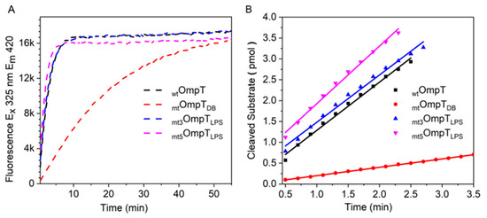 Comparison of enzyme activities of the four OmpT variants (OmpT, mtOmpTDB, mt3OmpTLPS, and mt5OmpTLPS): (A) FRET-based activity measurements; (B) initial velocity measurements used to calculate specific activity, Table 1.
