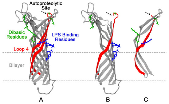 Structure of outer membrane protease (OmpT) and its autoproteolyzed fragments. (A) Ribbon representation of OmpT with the five predicted lipopolysaccharide (LPS) binding residues (blue) and the three dibasic sites represented in licorice (green). Black arrow points at the location of the dibasic site on loop 4 (red) that is prone to autoproteolysis yielding the two autoproteolytic fragments (B,C). Note: Crystal structure of wild type OmpT is not available. The Protein Data Bank (PDB) structure (1I78) of mtOmpTDB, an OmpT mutant (mt) that has one of its dibasic (DB) sites mutated (K217-R218 mutated to K216-G217-R218), is used here to illustrate the different key points, e.g., the locations of the autoproteolytic and predicted LPS binding residues.