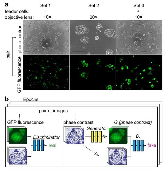 We used miPS-LLCcm cells as a model of CSCs [3]. The Nanog-GFP reporter gene-harboring miPS-LLCcm cells allows us to easily acquire information on the pluripotency of cells by examining the GFP fluorescence [16]. The characteristics of miPS-LLCcm cells as CSC were previously proved by the evidence of the Nanog expression, diverse SC markers expression and the mouse in vivo experiments [3]. The SC markers were disappeared in correlation with the loss of the Nanog expression. The AI was expected to learn the morphology of miPS-LLCcm cells shown on phase contrast cell images in relation to the corresponding GFP fluorescence. We examined both the training and procurement of the AI that predicts GFP fluorescence positive miPS-LLCcm cells in phase contrast cell images without GFP fluorescence image information. Three types of image datasets were used for AI to evaluate the difference in magnitude of the objection lenses and the presence of MEF feeder cells (Figure 1a). The miPS-LLCcm cells on MEF had morphological characteristic features of dense, stacked, round, and aggregated cells, which differed from cells on the porcine-skin gelatin-coated surface. We observed that the GFP fluorescence of each cell did not show an equivalent intensity, although they were all GFP fluorescence positive. In fact, each cell within the same colony showed diverse intensity. The GFP fluorescence was almost absent in some cells. The fluorescence property was consistent with previous reports [3,16]. We utilized the software pix2pix to perform deep learning of cell images using CGAN [12]. Pix2pix accepts image pairs of phase contrast and fluorescence images (Figure 1b). The discriminator learns whether the image pair belongs to a real pair or a fake pair which includes images synthesized by the generator. The generator learns to trick the discriminator. Two hundred epochs were applied for all training.
