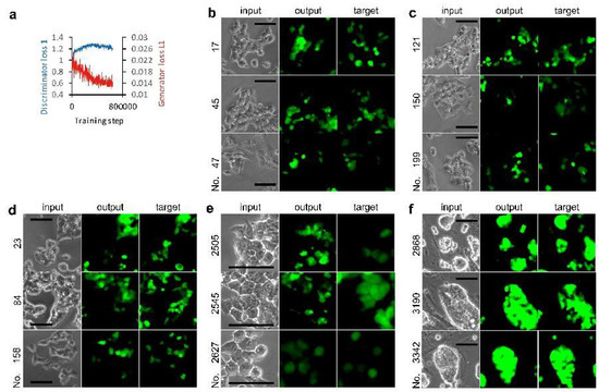 miPS-LLCcm cell image mapping from phase contrast to green fluorescent protein (GFP) fluorescence. (a) Effect of training steps on loss functions. (b–f) Output examples by AI models. Test phase contrast images were subjected to AI models for depicting fluorescence images. Input and target are the image of a pair for the evaluation of the depicted image. Images used for training AI for AI models: Set 1 images (a,b) without selection, (c) with selection of eliminating blanks, and (d) with selection of center; (e) Set 2 images with selection of eliminating blanks; and (f) Set 3 images with center selection. Bars = 100 µm.
