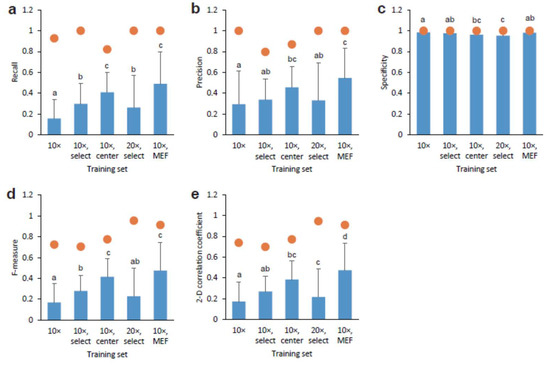 Comparison of depicted CSC images by AI models with original GFP fluorescence. Various AI models obtained from training sets were compared using AI output images and each true target image: (a) recall, (b) precision, (c) specificity, (d) F-measure, and (e) 2D correlation coefficient. Closed circles indicate maximum values. Mean ± S.D., n = 100 (exception: n = 40 for AI model obtained using training set 10× center). Identical letters labeled up the bars represent no significant difference, p < 0.05, and vice versa.
