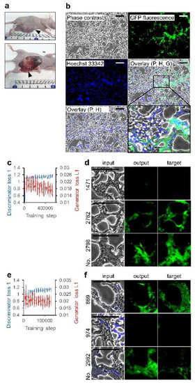 Deep learning of miPS-T47Dcm cell morphology in tumor tissue. (a) Primary subcutaneous tumors; arrowhead indicates tumor tissue. (b) Tumor tissue section visualized with phase contrast, Hoechst 33342, and GFP fluorescence using objection lens 20×. P: phase contrast; H: Hoechst 33342; G: GFP. Bars = 100 μm. An area in overlay (P, H, G) is shown in detail. (c,e) Effect of training steps on loss functions. (d,f) Output examples by AI models. Test phase contrast images were subjected to AI models for depicting fluorescence images. Input and target are the pair image for the depicted image evaluation. The AI models trained with the set of (c,d) phase contrast and GFP images, and (e,f) Hoechst 33342 overlaid-phase contrast and GFP images. Bars = 100 µm.
