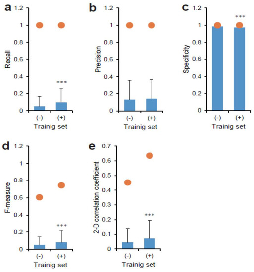 Moreover, we evaluated the similarity between the output and the target using various values (Figure 5a–e). Interestingly, the training set with the Hoechst 33342 overlaid-phase contrast had a significantly higher recall value compared to sets without Hoechst 33342 (Figure 5a). Each maximum value was 1.0, although the mean values varied from 0.05 to 0.10. The training sets did not affect the precision values (Figure 5b). Accordingly, the F-measure value was significantly increased in the training set with the Hoechst 33342 overlaid-phase contrast (Figure 5d). A similar effect was observed in the 2-D correlation coefficient values (Figure 5e). In contrast, the mean specificity values were almost 1.0 for both training sets (Figure 5c). Although a significant difference was observed, it would be largely meaningless in view of tumor diagnosis.