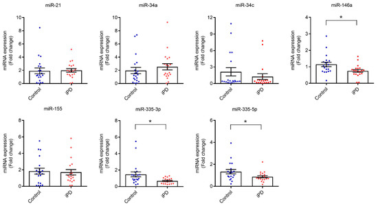 miR-34b showed undetectable levels in all serum samples, being excluded from further analysis. Moreover, miR-21, miR-34a, miR-34c, and miR-155 expression levels did not change between iPD patients and healthy controls (Figure 1). Importantly, miR-146a, miR-335-3p, and miR-335-5p were significantly decreased in iPD patients versus controls (p < 0.05).
