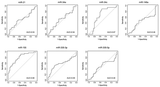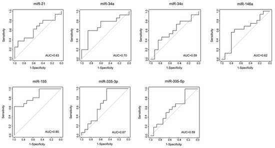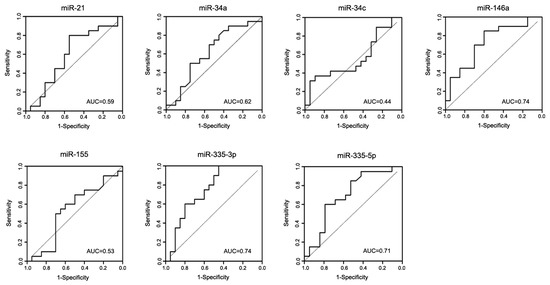 Receiver operating characteristic (ROC) curves of miRNAs in the discovery cohort, discriminating between iPD patients and controls. The true positive rate (sensitivity %) is plotted as a function of the false positive rate (100%—specificity) for the seven miRNAs individually. Area under the curve (AUC) values are indicated in each plot.