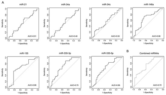 Combining both discovery and validation cohorts, miR-146a, miR-335-3p, and miR-335-5p demonstrate moderate ability to discriminate between iPD patients and healthy controls (AUC = 0.68, AUC = 0.70, and AUC = 0.66, respectively) (Figure 5A). Additionally, binary logistic regression analysis was used to investigate if a combination of different miRNAs could improve their diagnostic accuracy. We created a model in which miRNAs found differentially expressed between iPD patients and controls (miR-146a, miR-335-3p, and miR-335-5p) were combined. We observed a slight increase in AUC value (AUC = 0.72) (Figure 5B).