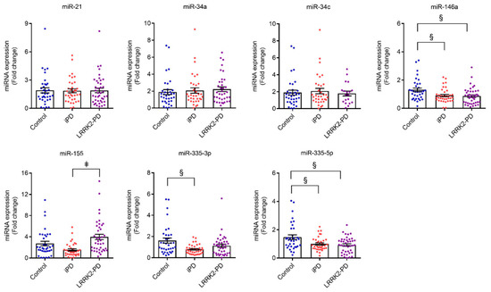 Our study aimed at identifying a panel of miRNAs whose expression is either altered or remain unaffected between PD-diagnosed patients and control subjects, which may become a relevant diagnosis tool to differentiate PD patients as well as contribute to further comprehend PD pathophysiology. A panel of miRNAs (miR-21, miR-34a, miR-34b, miR-34c, miR-146a, miR-155, miR-335-3p, and miR-335-5p) was selected from the literature, previously described to be involved in inflammatory and/or cell death pathways and deregulated in PD or other neurodegenerative diseases. We identified a differential pattern of miRNA expression between PD patients, including iPD and LRRK2-PD patients, and age- and gender-matched healthy controls, with a downregulation of miR-146a, miR-335-3p, and miR-335-5p in PD patients versus controls and no significant variation in the other miRNAs under investigation.