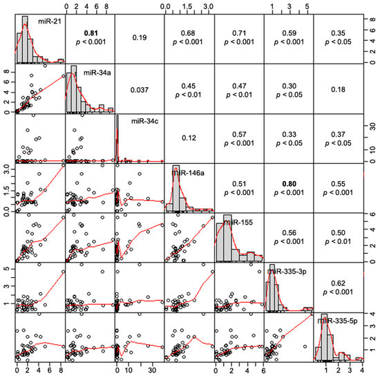 As expected, according to the study design, no significant differences were found for age at inclusion or gender between all groups in the discovery cohort (50% male, p = 1.000; age control: 69.5 ± 8.08; and age iPD: 71.6 ± 9.17, p = 0.4469) or in the validation cohort (46.6% male, p = 0.499; age control: 65.3 ± 8.3; age iPD: 69.2 ± 11.3; and age LRRK2-PD 70.0 ± 9.0, p = 0.271). Correlations between miRNA expression and clinical parameters (age, age at symptom onset, disease duration, Hoehn & Yahr stage, dyskinesias, motor fluctuation, and tremor predominant at onset) were determined for both cohorts. However, no significant correlations were observed after controlling for age and sex (Tables S1 and S2). Moreover, to determine if there was a correlation between the expression levels of the different miRNAs, a correlation analysis was also performed. Overall, in the discovery cohort, we observed ten significant positive correlations between miRNAs, of which the most prominent were between miR-21 and miR-34a (r = 0.81, p < 0.001) and between miR-146a and miR-335-3p (r = 0.80, p < 0.001) (Figure 8). In accordance, in the validation cohort, the same prominent correlations were observed (Figure S2), while, in the combination of discovery and validation cohorts, six positive correlations were observed, being the most prominent also between miR-21 and miR-34a (r = 0.80, p < 0.001) and between miR-146a and miR-335-3p (r = 0.64, p < 0.001) (Figure S3).