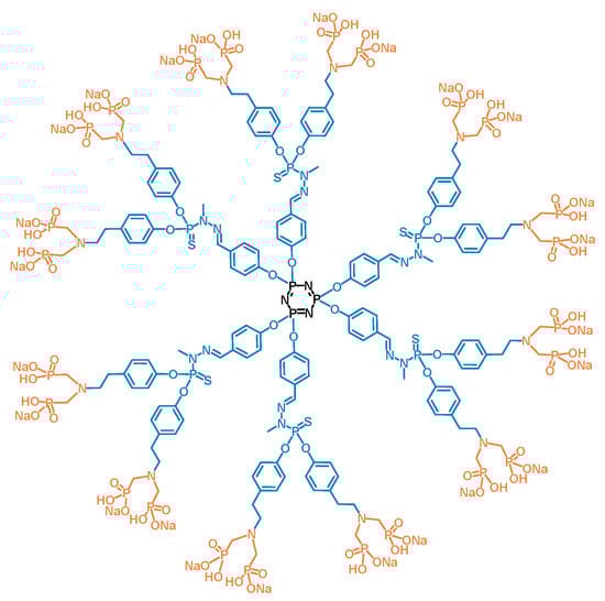 Two-dimensional structure of the azabisphosphonate (ABP) dendrimer. The cyclotriphosphazene core (N3P3) is in black, and the poly(phosphorhydrazone) (PPH) branched monomers (including the point of divergence) are in blue. The tyramine-based (in blue) ABP surface groups are in orange.